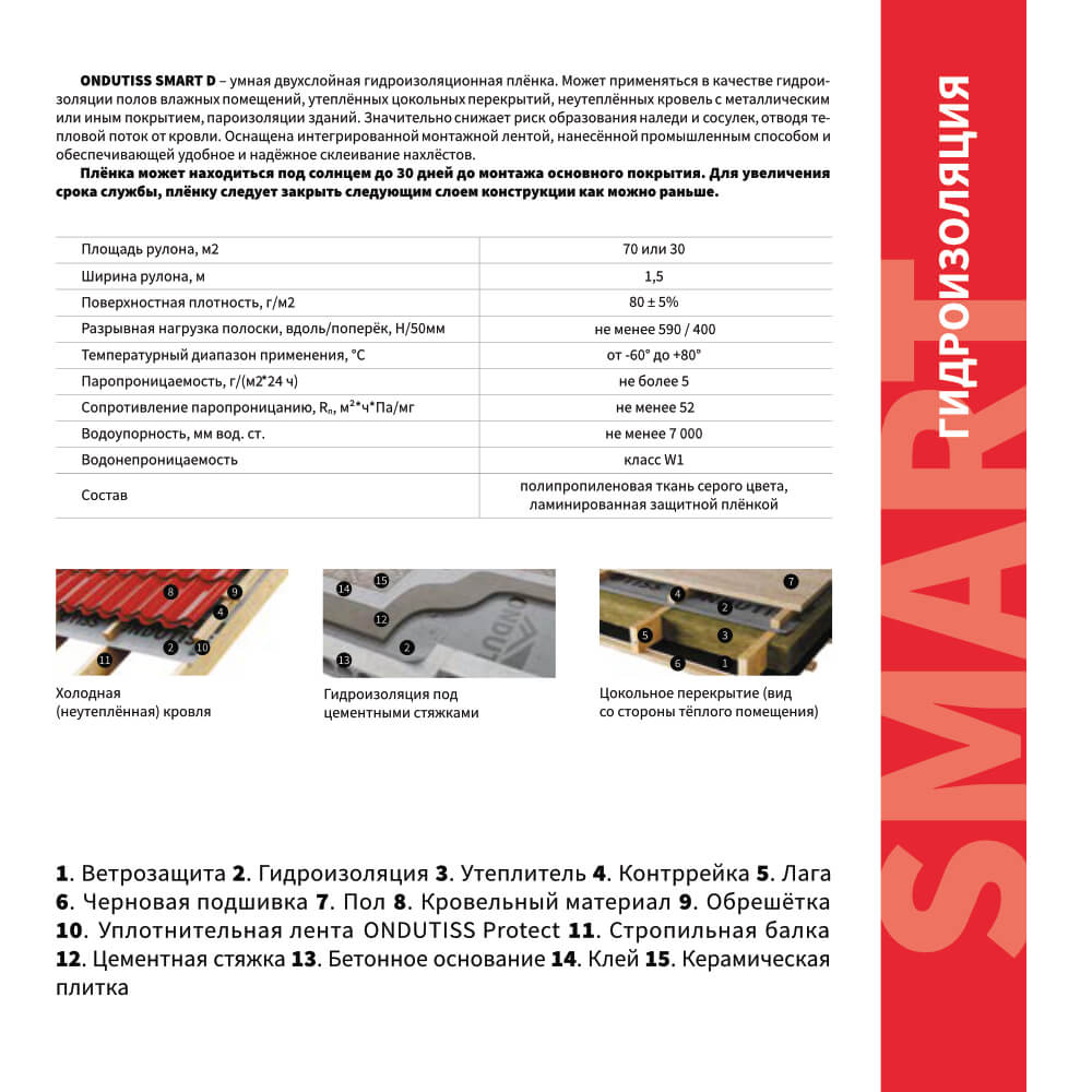 Гидроизоляция Ондутис Smart D (ONDUTISS SMART D) – умная двухслойная (плетёная основа из полипропилена заламинированная с одной стороны) гидроизоляционная плёнка в рулоне 1.5×20м, 30м2 с интегрированной монтажной лентой. Может выполнять функции пароизоляции.