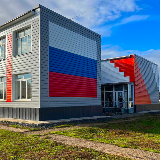 Фасад МБОУ СОШ из металло сайдинга Евро-Брус под брус цвета в ассортименте